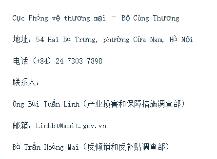 调查机关(越南工贸部贸易防卫局)联系方式: