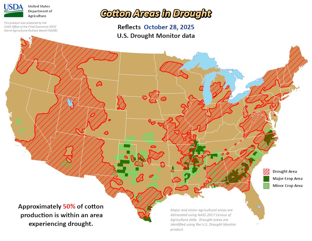 美国农业部(USDA)下属的首席经济学家办公室(OCE)当地时间周四根据当日发布的美国旱情监测图整理的美国农业旱情文件显示,截至10月28日当周,大约50%美棉产区受到干旱影响,前一周为62%。