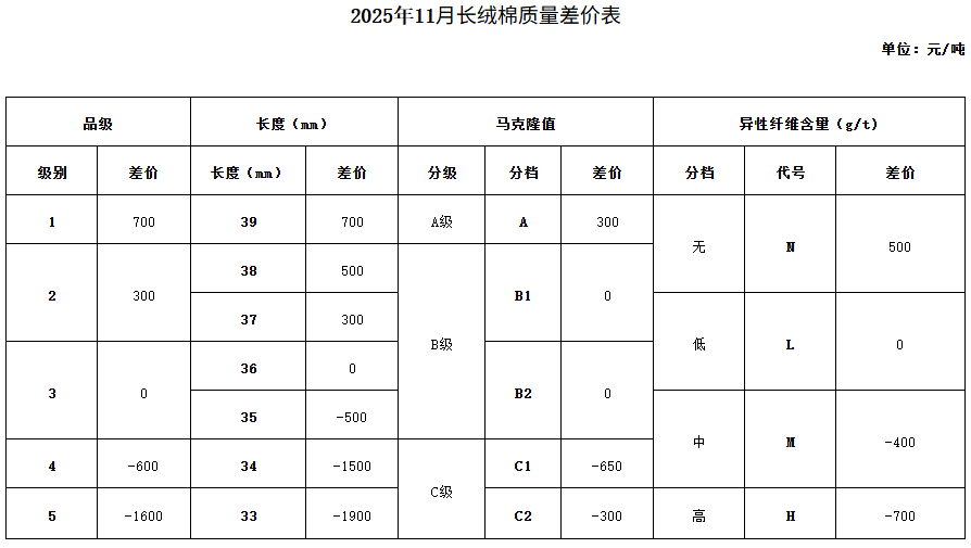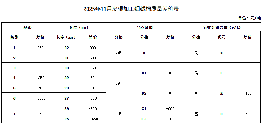 根据《中国棉花协会国产棉质量差价表管理办法》规定,现正式发布2025年11月《锯齿加工细绒棉质量差价表》、《皮辊加工细绒棉质量差价表》、《长绒棉质量差价表》(单位:元/吨)。