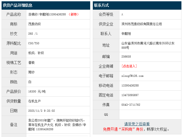 11月3日,滨州茂泰纺织有限责任公司涤棉纱C50/T50 26S,报价为16300元/吨,实际成交价以协商为准。[点击查看详情]