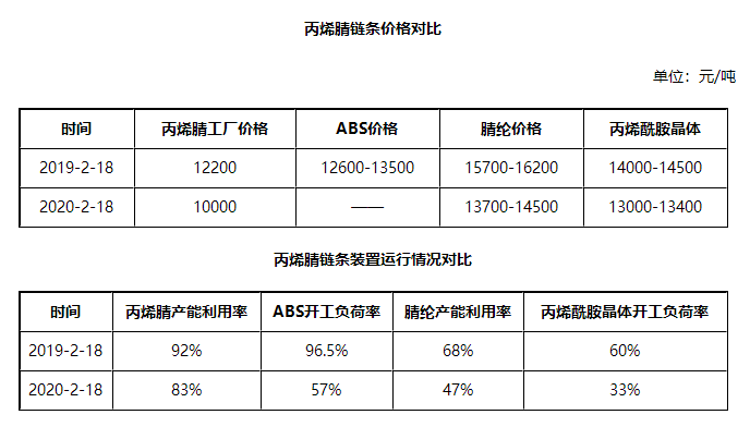 从行业整体运行看,虽丙烯腈行业变动不大,但主流下游工厂装置负荷运行低位,也与往年表现明显不同,且目前终端工厂复工缓慢,链条各产品均有不同程度库存累积,整体看空气氛明显,厂商操盘信心不足。