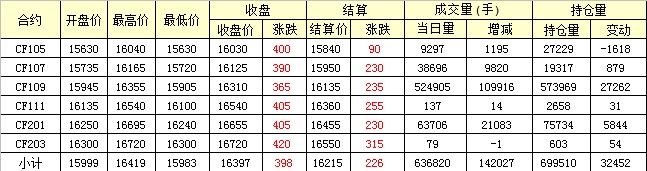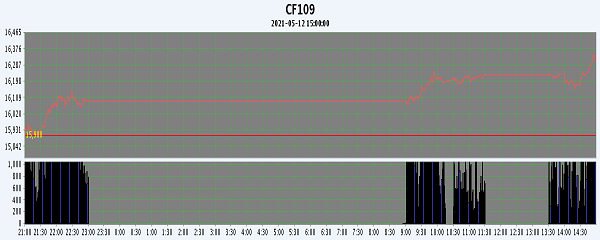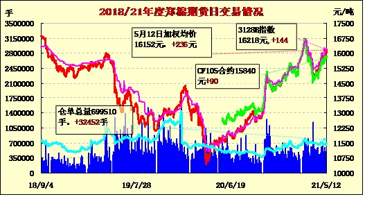 5月12日,隔夜郑棉高开调整后在多头买盘推动下上扬,今日早盘维持增仓上行格局,午后盘整,尾盘增量收高,日线形成阳线,日内成交量放大 ,主力合约持仓量增加。