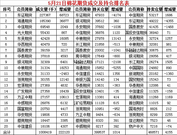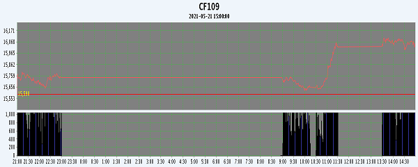 5月21日,隔夜郑棉低开下滑,今日早盘维持区间走势,午后多头买盘推动期价扬升,此后高位震荡,日线形成阳线,日内成交量放大,主力合约持仓量减少。今日郑棉CF09合约上涨收阳线,期价突破10日均线与前五个交易震荡区间高点,技术面转强,短线走势利多。
