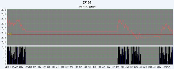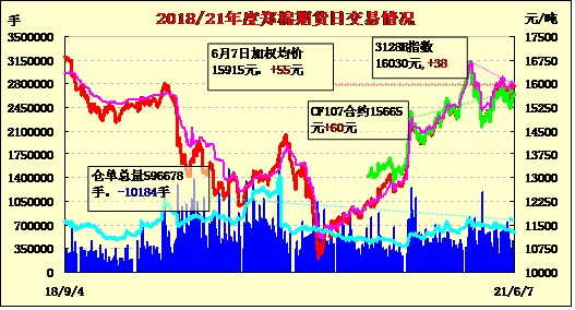 6月7日,隔夜郑棉高开下滑,今日早盘受外棉上涨带动短线上冲,随后平仓盘压制期价调整,午后反弹后再度回落,日线形成高开阴线,日内成交量下降,主力合约持仓量减少。今日郑棉CF09合约高开调整收阴线,期价未破均线;60分钟图形继续在前一日交投区间内震荡,短线尚未形成反转信号,但是近期近月减仓量远大于远月增仓量,市场投机兴趣不足,加之市场近期传闻抛储,短线需关注远月在15900附近的支撑作用。5.21-5.27日一周美国净签约出口2020/21年度陆地棉40982吨,较前一周和近4周平均分别增加6%和82%;装运2020/21 年度陆地棉83121吨,较前一周和近4周平均分别增加13%和5%。净签约本年度皮马棉1656吨;装运皮马棉3084吨。2020/21年度陆地棉签约22407吨,无皮马棉新签约。其中中国对本年度陆地棉净签约量10092吨,装运21863吨;皮马棉净签约136吨,装运45吨。无下年度签约。