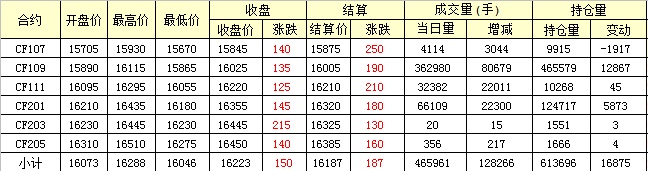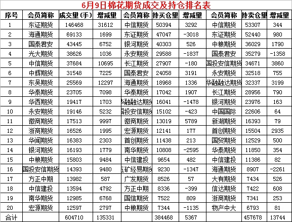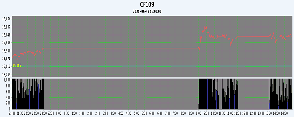 6月9日,隔夜郑棉盘整,今日早盘受外棉上涨带动增仓上冲,随后区间盘整,日线形成阳线,日内成交量温和放大,主力合约持仓量增加。