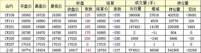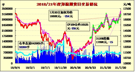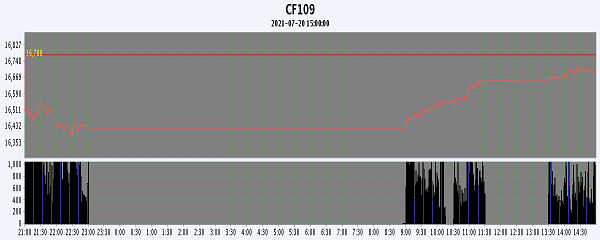7月20日,隔夜郑棉低开下探,今日早盘在空头回补支撑下回升,日线形成长下影线的阳线。日内成交量放大,持仓量近减远增。