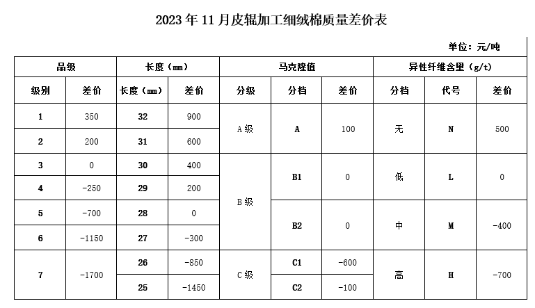 根据《中国棉花协会国产棉质量差价表管理办法》规定,现正式发布2023年11月《锯齿加工细绒棉质量差价表》、《皮辊加工细绒棉质量差价表》和《长绒棉质量差价表》(单位:元/吨)。