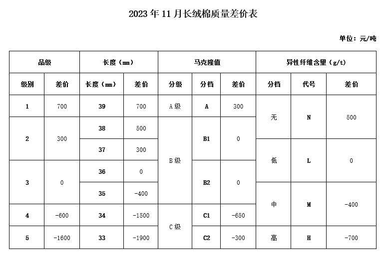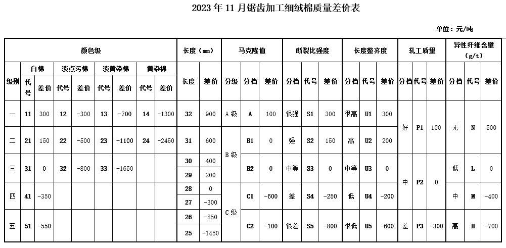 依据2023年10月的棉花公检质量数据、中国棉花协会棉花质量价差自动生成系统采集的棉花加工企业销售成交价、纺织企业监测点的采集数据及当月的中国棉花价格指数,并征求业内相关专家的意见,与上月相比,2023年11月《锯齿加工细绒棉质量差价表》、《皮辊加工细绒棉质量差价表》和《长绒棉质量差价表》差价保持不变。
