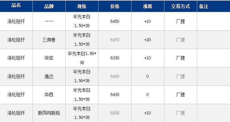 江苏涤纶短纤现货价格上涨10元到6450元/吨。成本端价格呈涨势,周初江苏涤纶短纤报价小幅跟涨。目前现货主流6430-6500元/吨自提,偏低6330元/吨附近自提。