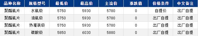 华东聚酯瓶片5780元/吨,涨跌值0元/吨,原料下跌,聚酯瓶片工厂报价稳定,市场重心僵持。10月货源报盘5750-5930,递盘盘5680-5770;或9-10月货源期货合约2511+10至30;11月货源2511合约平水,临近国庆假期,下游及贸易商补货心态不佳,商谈氛围清淡。