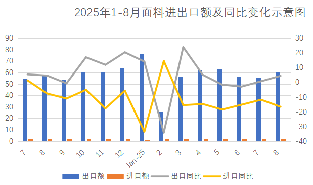 从纱线面料整体出口看,2025年1-8月我国纱线面料出口555.4亿美元,同比增长2.8%。从具体产品看,纱线出口99亿美元,同比增长5.3%,面料出口456.4亿美元,同比增长2.3%。