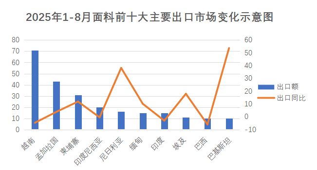 亚洲是我国面料出口主要市场,2025年1-8月我国对亚洲国家出口面料303.2亿美元,占面料出口总额的66.4%。在前十大目标市场出口中,亚洲市场占了6席。越南作为我国面料出口最大的单一市场,占我国面料对全球出口的15.7%,出口额62亿美元,同比下降6%。