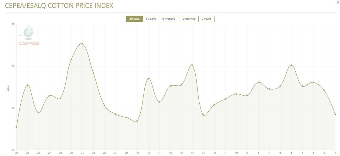 11月21日(周五),巴西CEPEA/ESALQ棉花价格指数报63.85美分/磅,较前一交易日下跌0.90%,较上月同期下降1.10%。