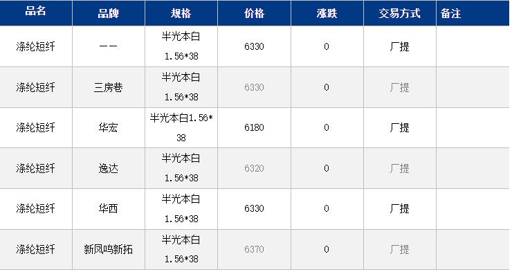 江苏涤纶短纤现货价格暂时稳定在6330元/吨;早间短纤价格暂时稳定整理,目前现货价格主流6320-6370元/吨自提,偏低6180元/吨附近自提。