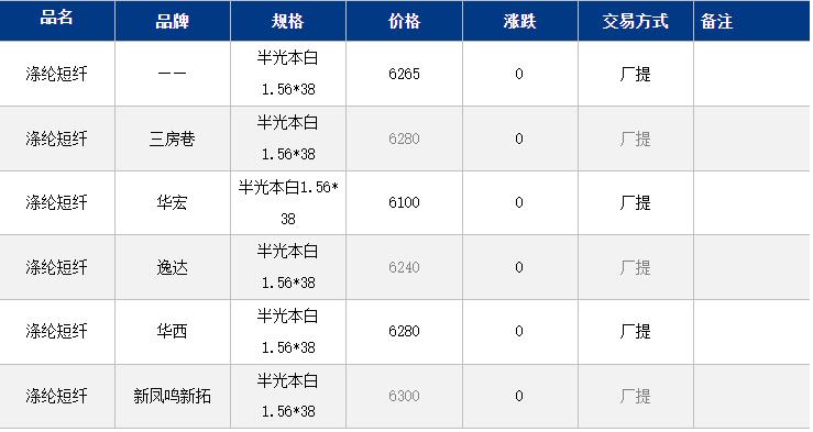 江苏涤纶短纤现货价格暂时稳定在6265元/吨;早间短纤期货偏弱震荡,现货价格变动不大;目前江苏主流6250-6310元/吨自提,偏低6100元/吨附近自提。