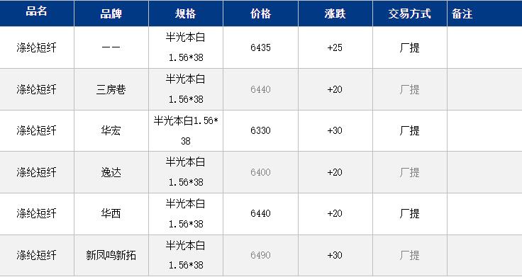 江苏涤纶短纤现货价格上涨25元到6435元/吨;成本继续推动,短纤期现货价格延续涨势;目前江苏主流6420-6500元/吨自提,偏低货源6320元/吨附近。