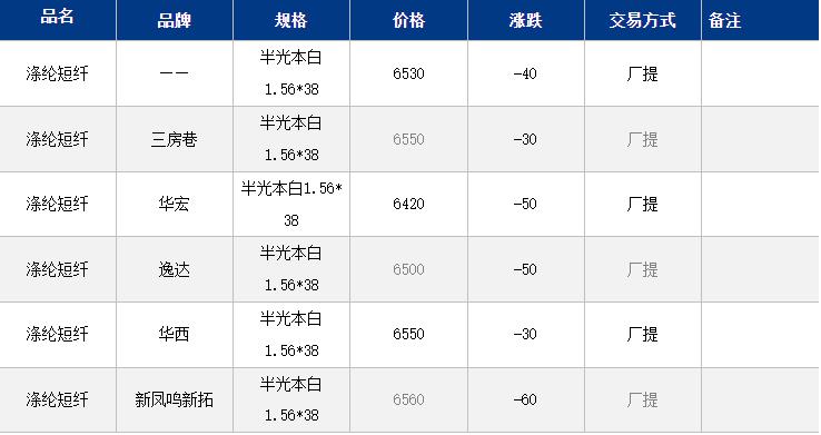 江苏涤纶短纤现货价格下跌40元到6530元/吨;夜盘至今,短纤期现货价格回落整理,目前江苏主流6460-6600元/吨自提,偏低货源6420元/吨附近。