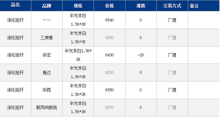 江苏涤纶短纤现货价格暂时稳定于6540元/吨;目前江苏主流6500-6600元/吨自提,偏低货源6420元/吨附近。