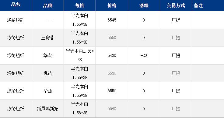 江苏涤纶短纤现货价格暂时稳定在6545元/吨;假期各环节小累库,且担忧需求负反馈,TA、EG、PF期货盘面偏弱震荡,但短纤现货价格总体波动暂不大,目前江苏主流6520-6580元/吨自提,偏低货源6420元/吨附近。