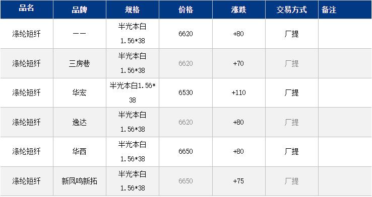 1.4D半光直纺涤纶短纤江浙商谈重心6600-6700元/吨出厂或短送,福建主流商谈6750-6800元/吨现款短送,山东、河北主流6750-6850元/吨送到。