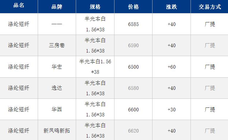 江苏涤纶短纤现货价格上涨40元在6585元/吨;早间江苏主流商谈6560-6640元/吨自提,偏低货源6500元/吨附近。