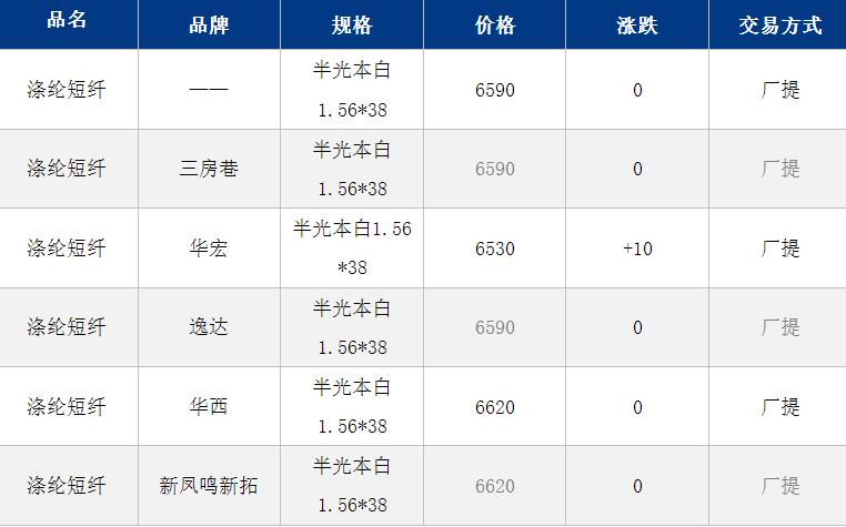 江苏涤纶短纤现货价格暂时稳定在6590元/吨;早间短纤价格变动不大,江苏主流商谈6560-6640元/吨自提。