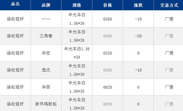 江苏涤纶短纤现货价格下跌10元到6580元/吨;成本下跌累及短纤市场,但临近年底市场渐进收尾,现货报盘不多;早间江苏主流商谈6550-6620元/吨自提。