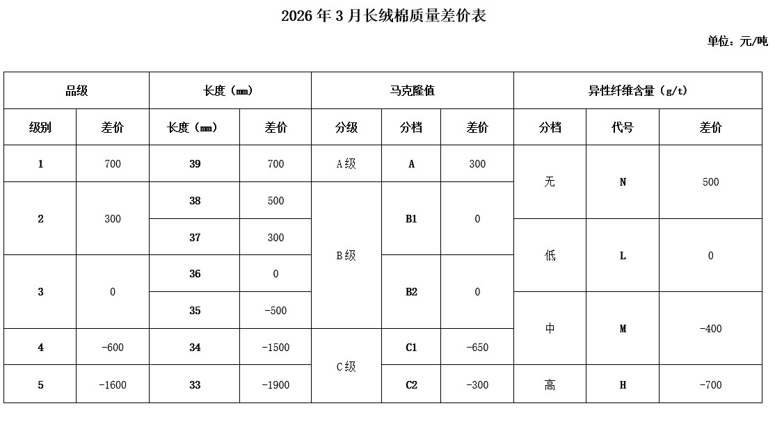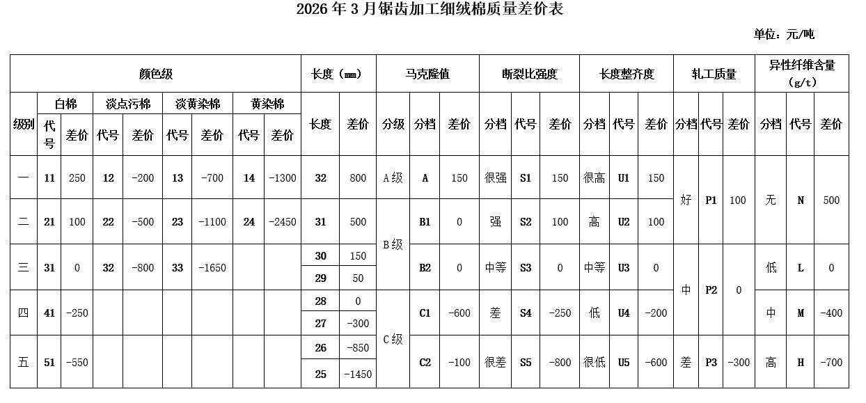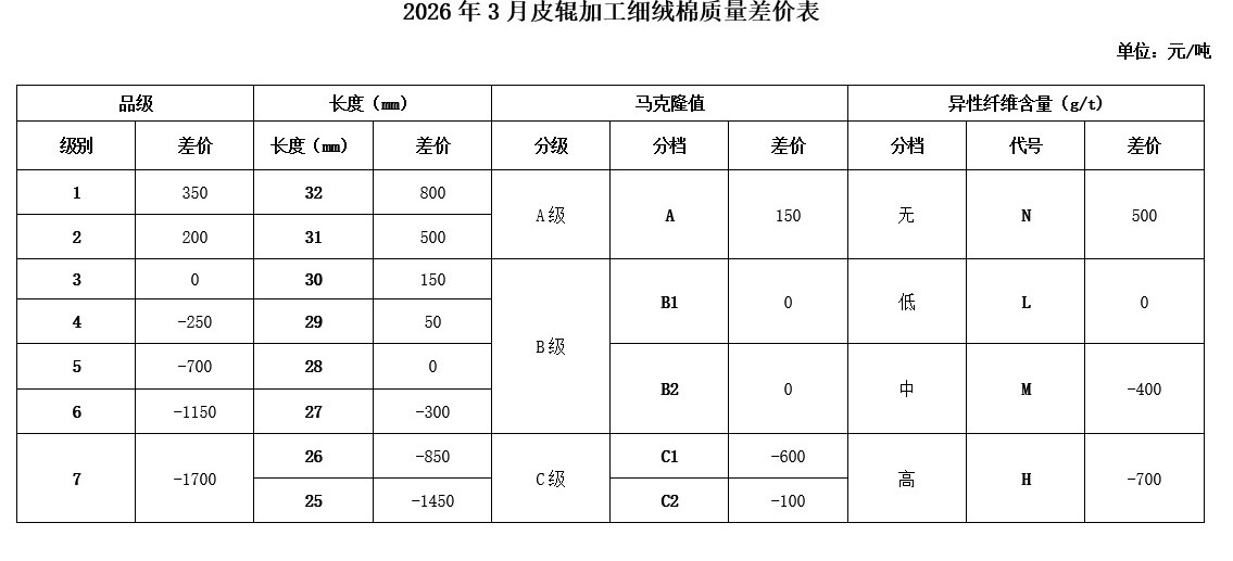 依据2026年2月的棉花公检质量数据、中国棉花协会质量差价系统采集的加工企业销售价和纺织企业到厂价,及当月的中国棉花价格指数,并征求业内相关专家的意见,与上月相比2026年3月《锯齿加工细绒棉质量差价表》、《皮辊加工细绒棉质量差价表》、《长绒棉质量差价表》差价均保持不变。