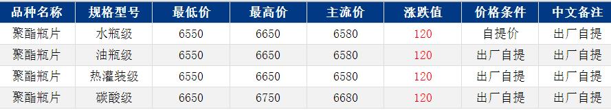 华东聚酯瓶片收于6580元/吨,涨跌值120元/吨,原油及原料继续上行,成本推动下,聚酯瓶片工厂报价多上调100元/吨,重心明显上行。场内低价货源消失,且出货价格变动较快,3月货源商谈6550-6650元/吨,递盘6540-6570元/吨,或期货合约2605+80。
