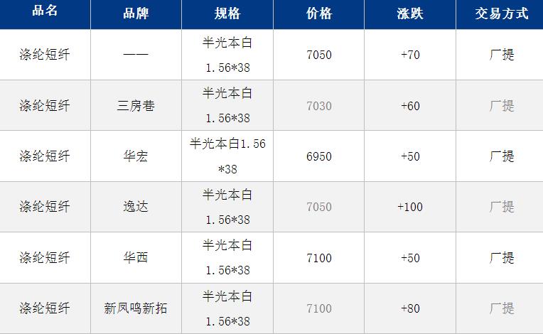 1.4D半光直纺涤纶短纤江浙商谈重心6950-7100元/吨出厂或短送,福建主流商谈7250-7400元/吨现款短送,山东、河北主流7050-7250元/吨送到。