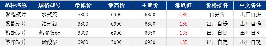 华东聚酯瓶片收于6850元/吨,涨跌值185元/吨,原油继续上涨,叠加PX某大厂1套装置停车检修,原料强势大幅上行。成本推动下,聚酯瓶片工厂报价上行200-370元/吨,重心随之上行。3月货源报盘6800-7000元/吨,早间6850元/吨商谈。