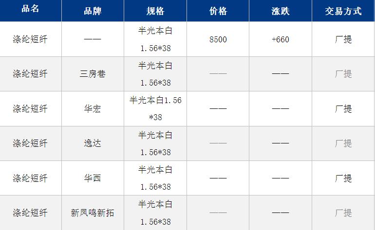 江苏涤纶短纤现货价格上涨660元到8500元/吨附近;石化减产波及原料,聚酯系期货盘中触及涨停,现货价格被动跟涨。