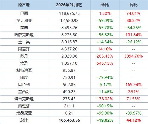 据海关统计数据,2026年2月我国进口棉花约17万吨,环比减少约4万吨,同比增长约44.1%。