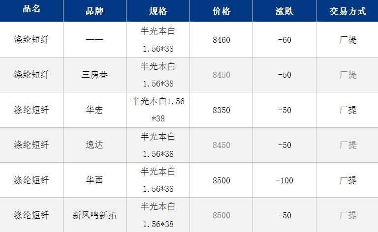 1.4D半光直纺涤纶短纤江浙商谈重心8350-8700元/吨出厂或短送,福建主流商谈8900-9100元/吨现款短送,山东、河北主流8500-8800元/吨送到。