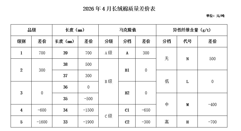 根据《中国棉花协会国产棉质量差价表管理办法》规定,现正式发布2026年4月《锯齿加工细绒棉质量差价表》、《皮辊加工细绒棉质量差价表》、《长绒棉质量差价表》(单位:元/吨)。