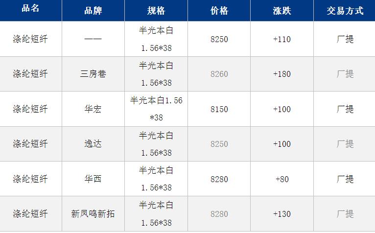 江苏涤纶短纤现货估价暂时上涨110元到8250元/吨;早间短纤现货估价商谈参考8200-8300元/吨,偏低8150元/吨附近自提。(单位:)
