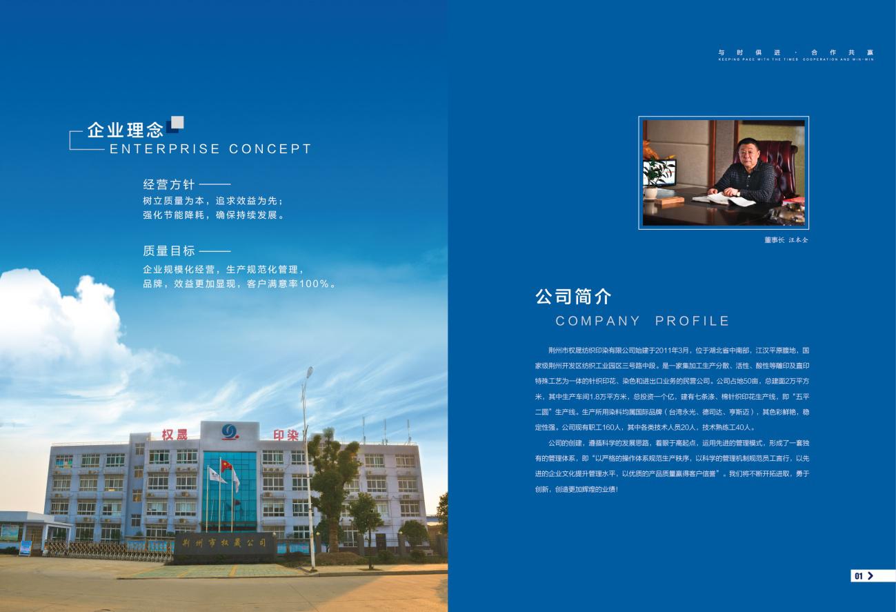 荆州市权晟纺织印染有限公司始建于20113月,位于湖北省中南部,江汉平原腹地,国家级荆州开发区纺织工业园区三号路中段。是一家集加工生产分散、活性、酸性等雕印及直印特殊工艺为一体的针织印花、染色和进出口业务的民营公司。公司占地50亩,总建面2万平方米,其中生产车间1.8万平方米,总投资一个亿,建有七条涤、棉针织印花生产线,即五平二圆生产线。生产所用染料均属国际品牌(台湾永光、德司达、亨斯迈),其色彩鲜艳,稳定性强。公司现有职工160人,其中各类技术人员20人,技术熟练工40人。 公司的创建,遵循科学的发展思路,着眼于高起点,运用先进的管理模式,形成了一套独有的管理体系,即以严格的操作体系规范生产秩序,以科学的管理规范员工言行,以先进的企业文化提升管理书评,以优质的产品质量赢得客户信誉。我们将不断开拓进取,勇于创新,创造更加辉煌的业绩!